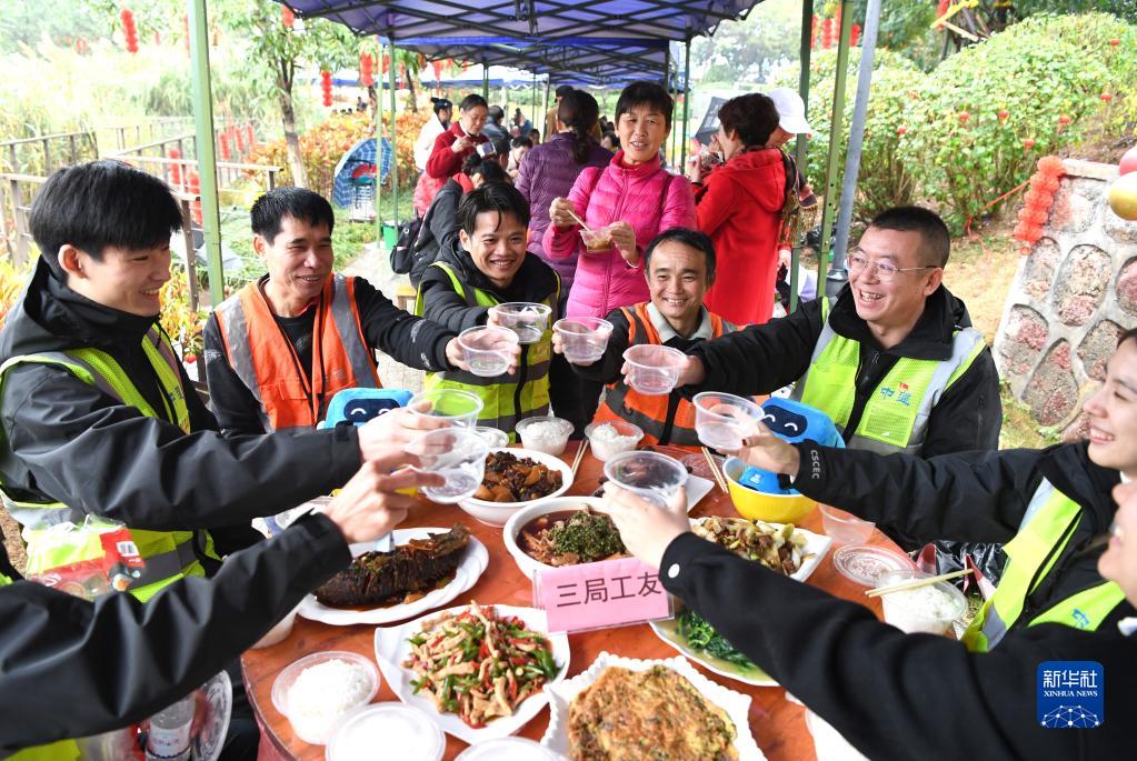 2月4日,广西南宁市良庆区良庆镇宋厢社区和中建三局第一建设工程有限责任公司联合举办“欢乐元宵百家宴”活动。这是居民和建筑工人一同参加百家宴。