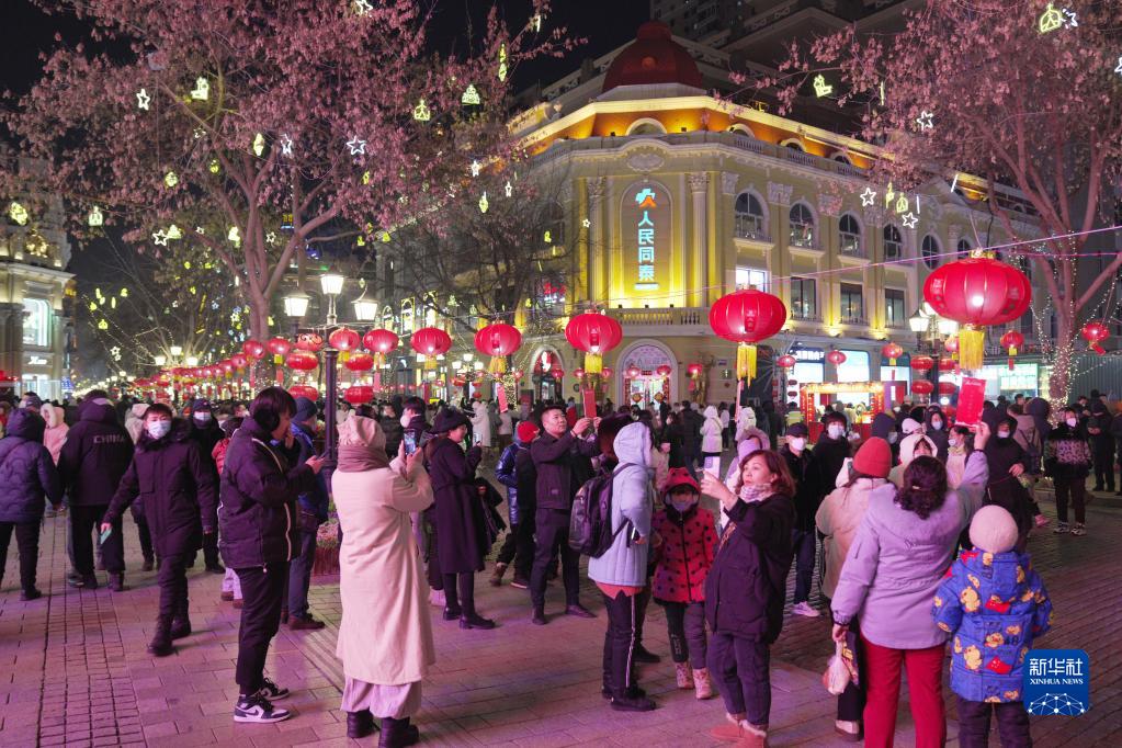 2月4日,游客和市民在黑龙江哈尔滨中央大街上猜灯谜。