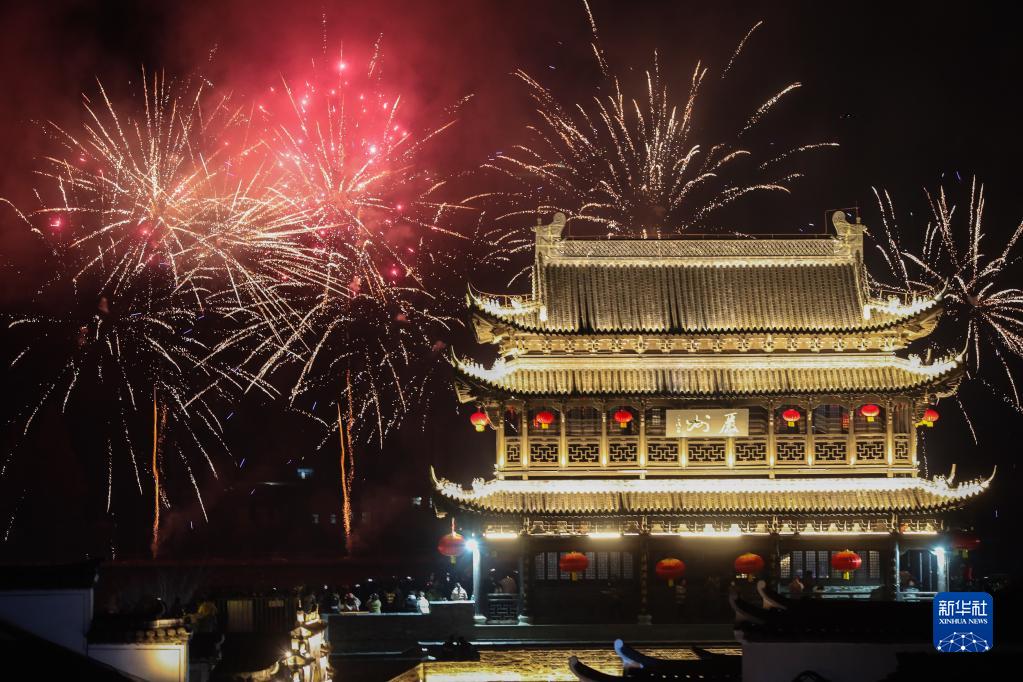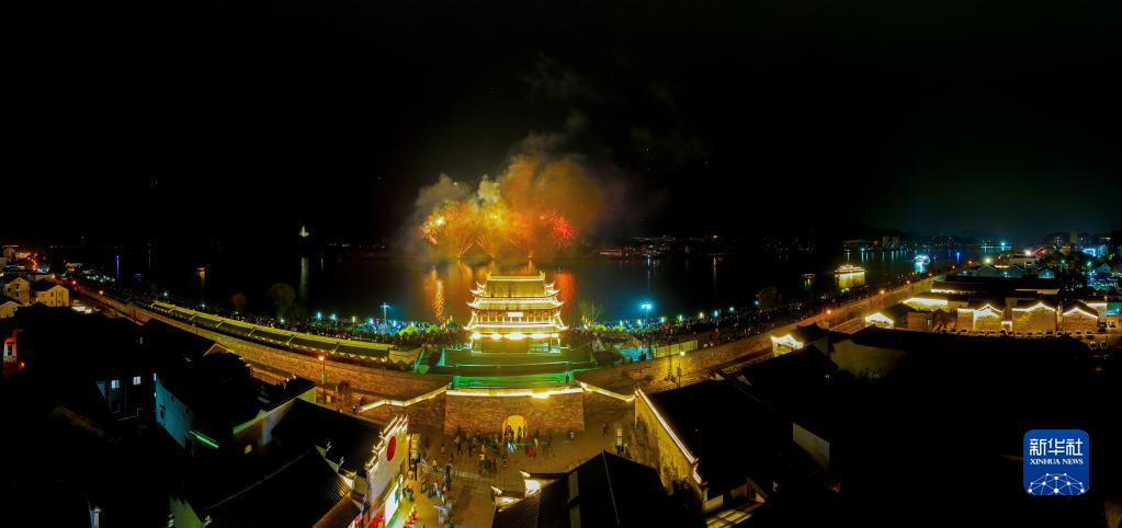 2月4日,浙江省建德市梅城镇严州古城的澄清门上空焰火绽放(无人机照片)。