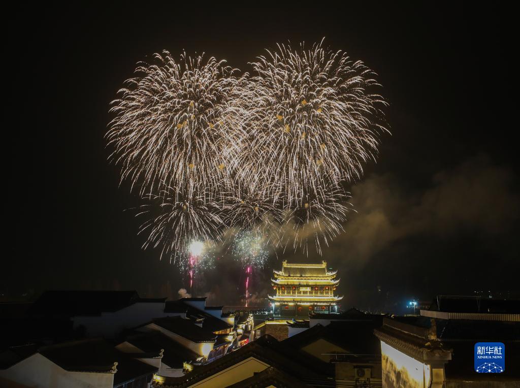 2月4日,浙江省建德市梅城镇严州古城上空焰火绽放(无人机照片)。