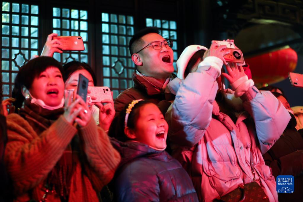 2月4日,市民、游客在浙江省建德市梅城镇严州古城观看焰火。