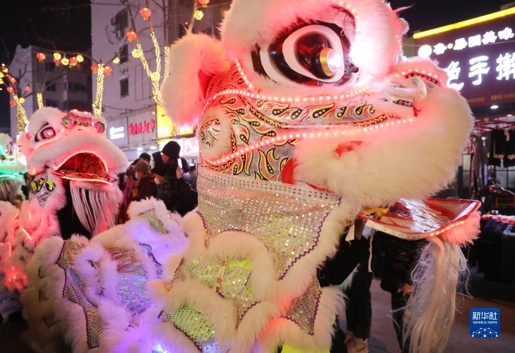 2月4日,民间艺人在山东青岛西海岸新区长江路街道濠洼夜市表演舞狮。