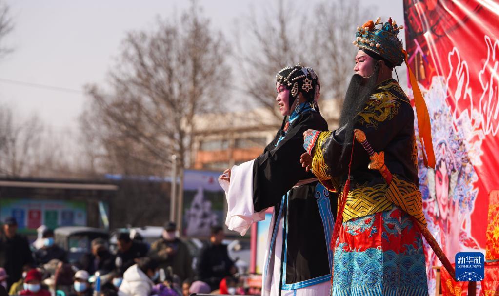 2月4日,山东省邹平市孙镇镇的庄户剧团在文化广场表演传统京剧《状元媒》。