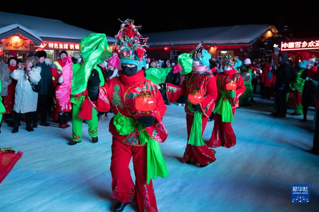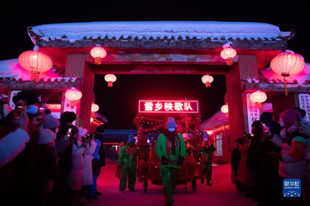 2月4日,秧歌队在位于黑龙江省牡丹江市的大海林林业局有限公司双峰林场雪乡景区内表演。