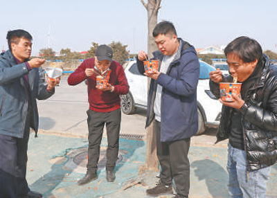 服务区 车队到达盐洛高速河南永城南服务区后,务工人员和带队干部围在一起,边吃边聊。