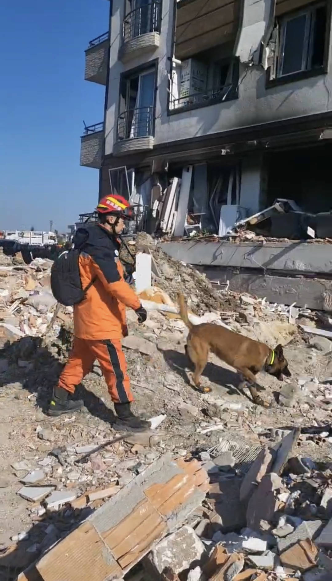 中国救援队抵达土耳其后就立即进入灾区,训导员将搜救犬带出航空箱后,就给它们穿上了“犬鞋”,“我们讲求‘人犬合一’,搜救犬受伤就相当于训导员受伤,而爪子是搜救犬在地震灾区最容易受伤的部位,因此我们提前做好了防护。”