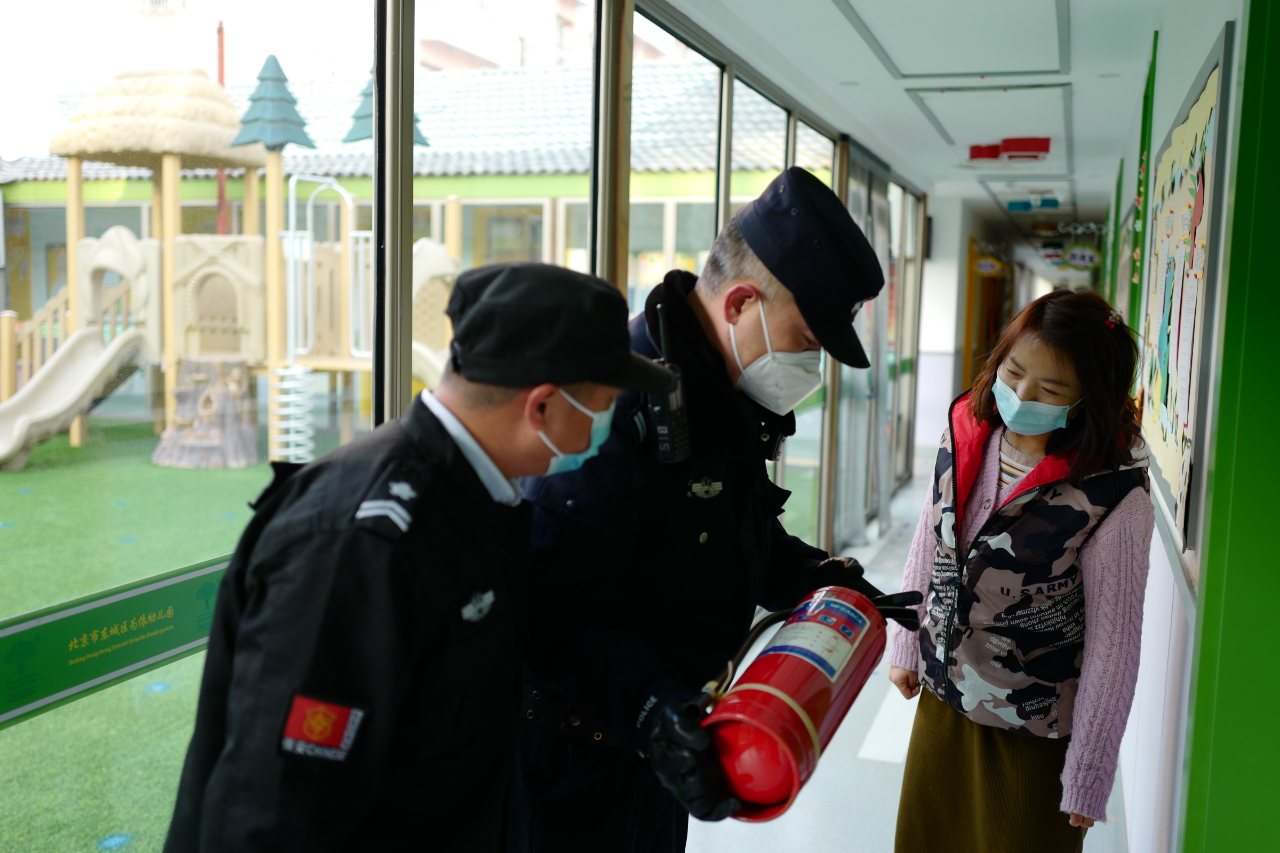 图为东城区民警开学首日在小学及幼儿园门口执勤并进行安全检查。