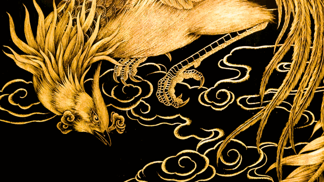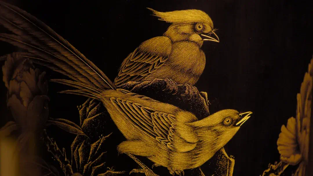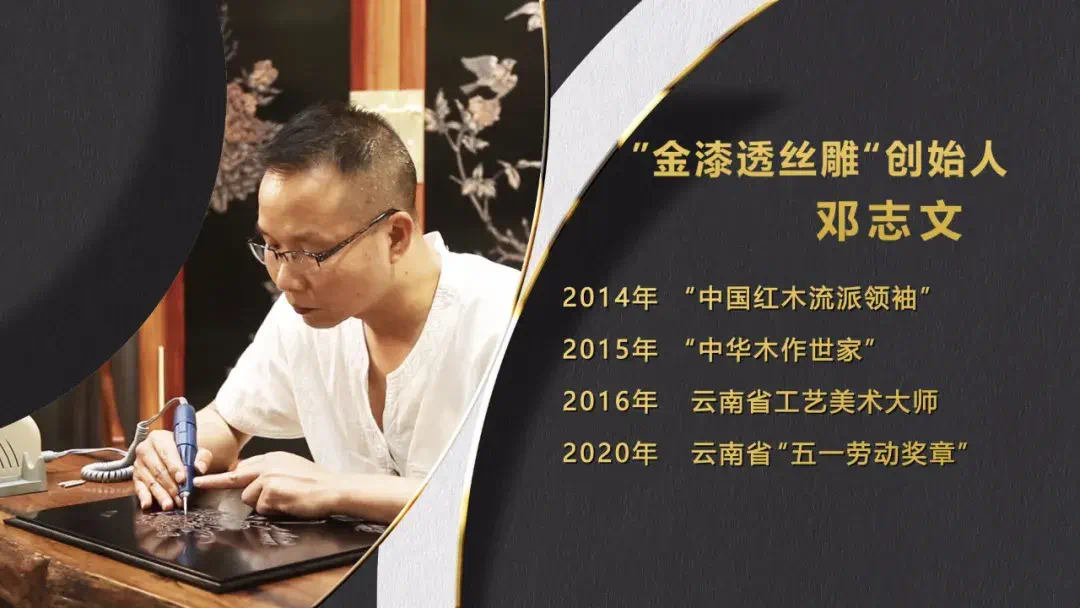 四年的苦心钻研,邓志文将古老的阴雕技艺演变创新,同时又吸取了漆雕和玉雕的特点,在经历无数次尝试与失败之后。终于,在2014年,一种全新的雕刻技艺“金漆透丝雕”,应运而生。2016年,此项技艺被列入非物质文化遗产保护名录,而邓志文也成为了“金漆透丝雕”创始人。