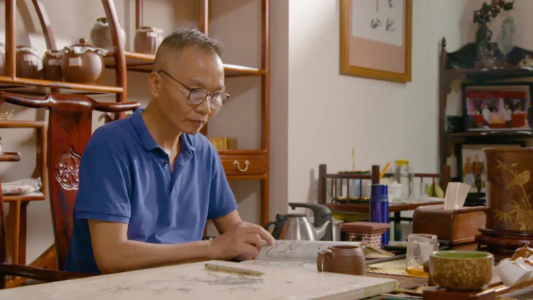 邓志文:“我的前辈们,包括我父亲这一辈。一般做木雕呢,都是凸出来的,你要凸出来就必须把周边的木头铲掉,那这样的话,我觉得就比较浪费这些资源,我在想怎么用一种雕刻,既能有这种层次感,又能珍惜这些稀缺资源。”