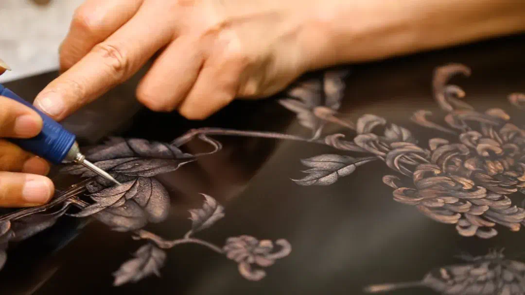 纯天然植物生漆通过高温煮后变成黑色,用灰棉纱擦在纯色的红木面板上,通过20多次反复的擦漆、打磨、自然凉干,直到木板表面平整,木孔消失,才能达到雕刻的要求。而此时,漆面的厚度大概只是一张A4纸的厚度。