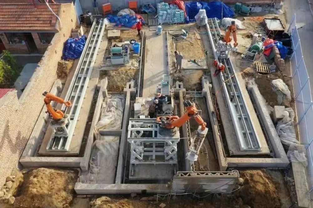 2021年8月,一台机器两人,三台机器六人,村宅打印全程160个小时。在打印阶段,徐卫国和团队都住在镇上,每天一大早去,晚上很晚回来。3D打印阶段要进厂装机器,机器装完后,机械臂前端的打印嘴会吐出纤维混凝土材料,直接打出地基和墙体。