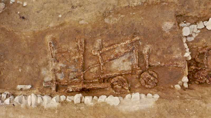 尼勒克吉仁台沟口遗址考古项目领队阮秋荣介绍,木质车辆构件发现于高台遗存东北部,40余件组的木质车辆构件中,实心木车轮11件,车辕、车轴、车厢等木构件30余件。“我们初步判断是营建高台坟冢过程中使用的,被废弃后进行了拆卸并有意识地集中掩埋,测年数据显示其年代距今3500年。”