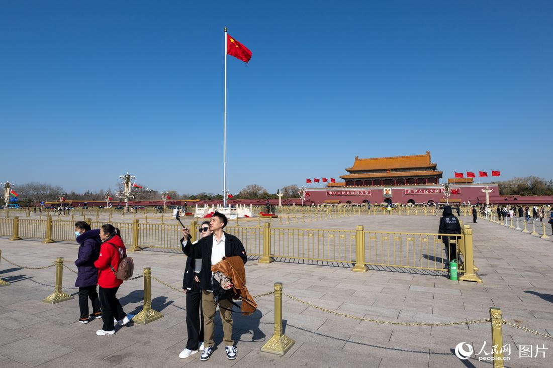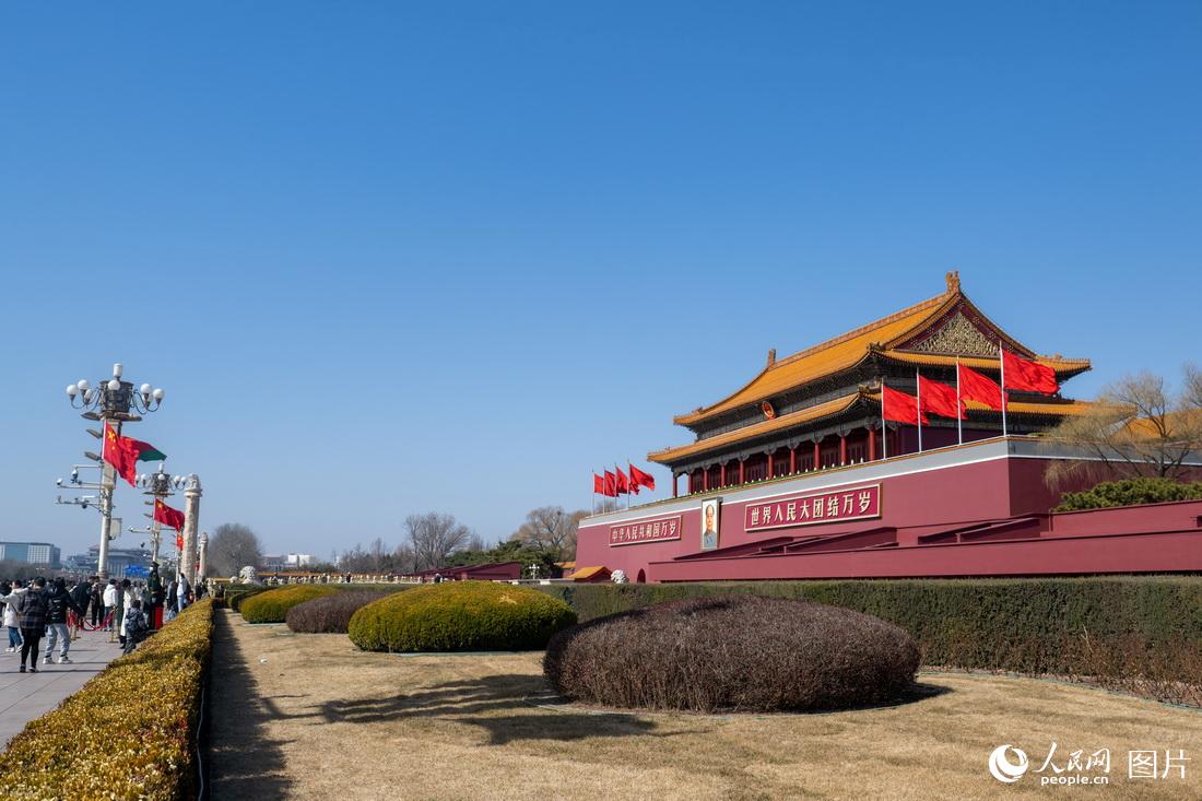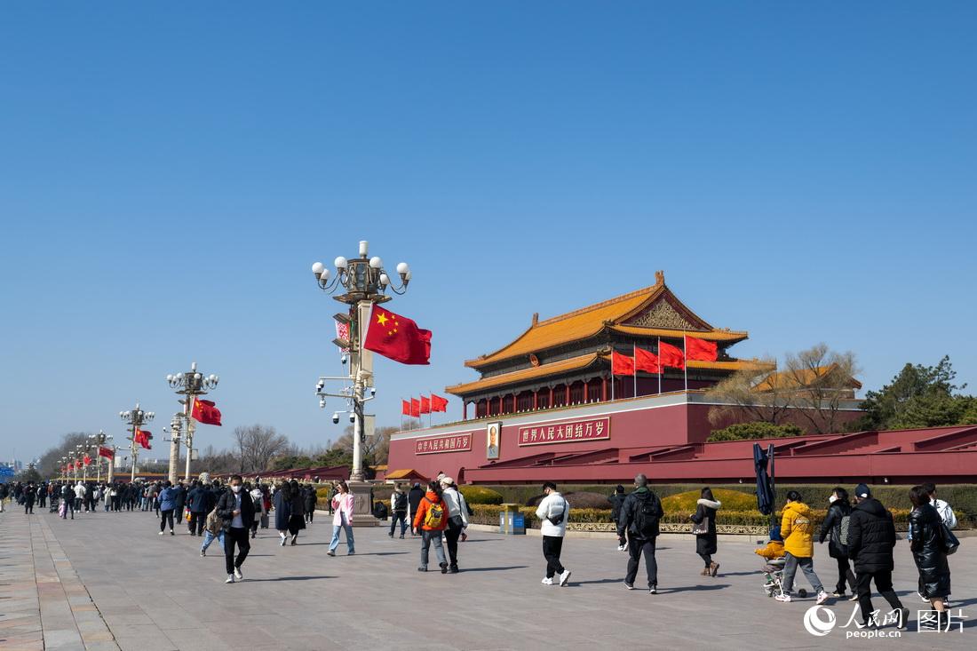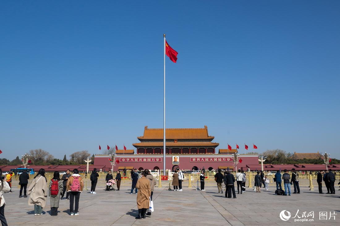 2023年3月2日,全国两会召开在即,北京天安门广场上红旗迎风招展,游客络绎不绝。