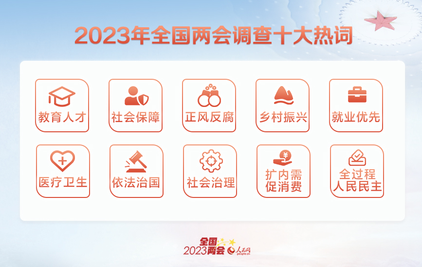 经过网友投票,“教育人才”“社会保障”“正风反腐”“乡村振兴”“就业优先”“医疗卫生”“依法治国”“社会治理”“扩内需促消费”“全过程人民民主”入选十大热词。