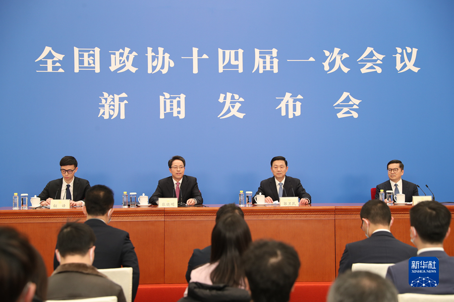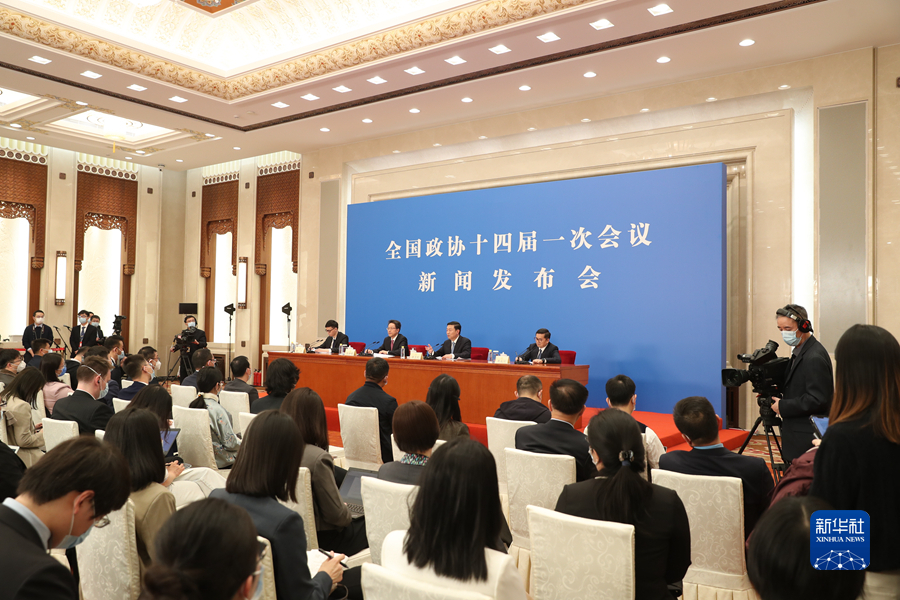 3月3日,全国政协十四届一次会议新闻发布会在北京举行,大会新闻发言人郭卫民向中外媒体介绍本次大会有关情况并回答记者提问。图为人民大会堂新闻发布厅现场。新华网记者 焦鹏 摄