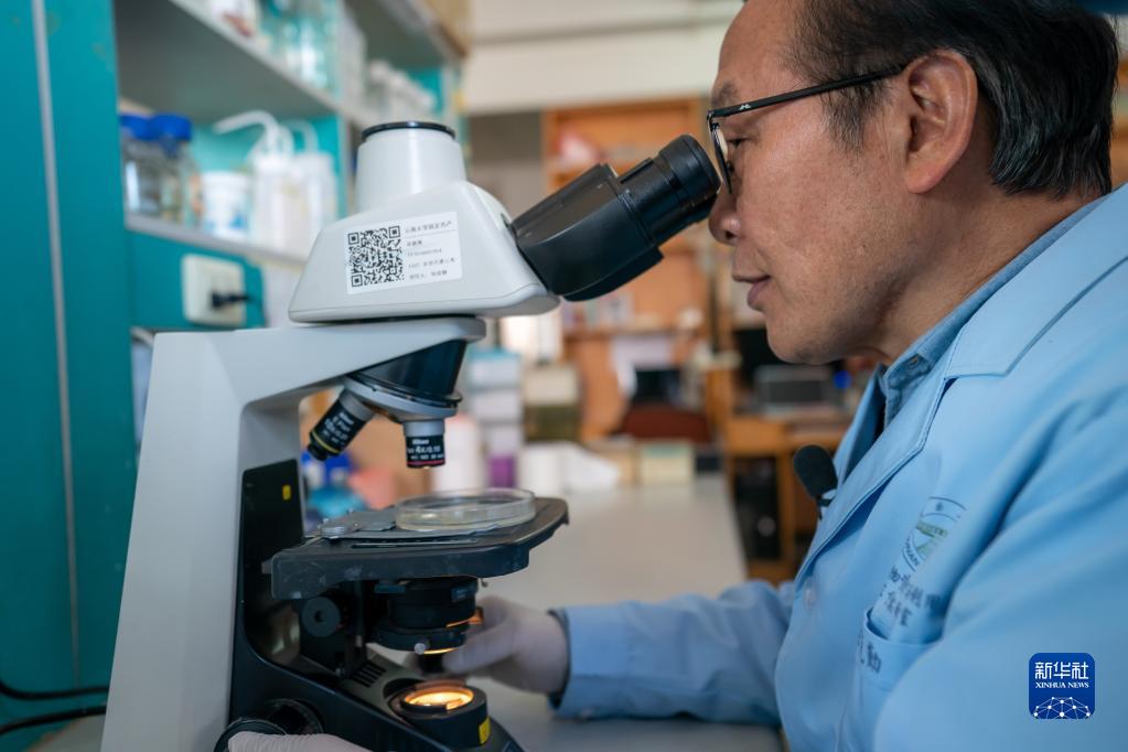 张克勤在实验室用显微镜观察线虫(2月6日摄)。 新华社记者 江文耀 摄