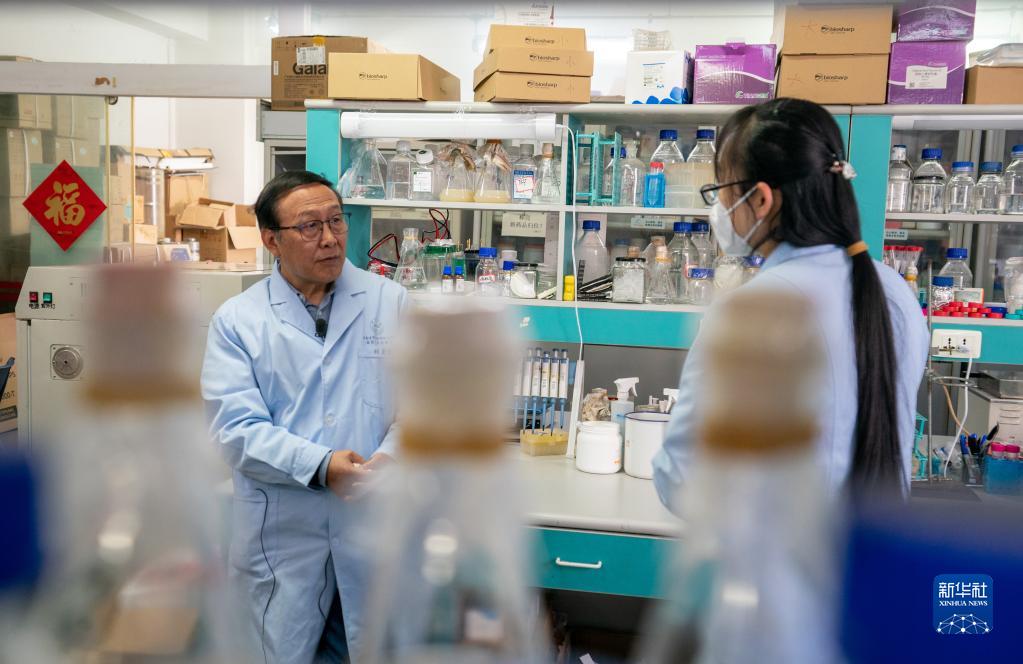 张克勤(左)在实验室了解实验进度(2月6日摄)。 新华社记者 江文耀 摄