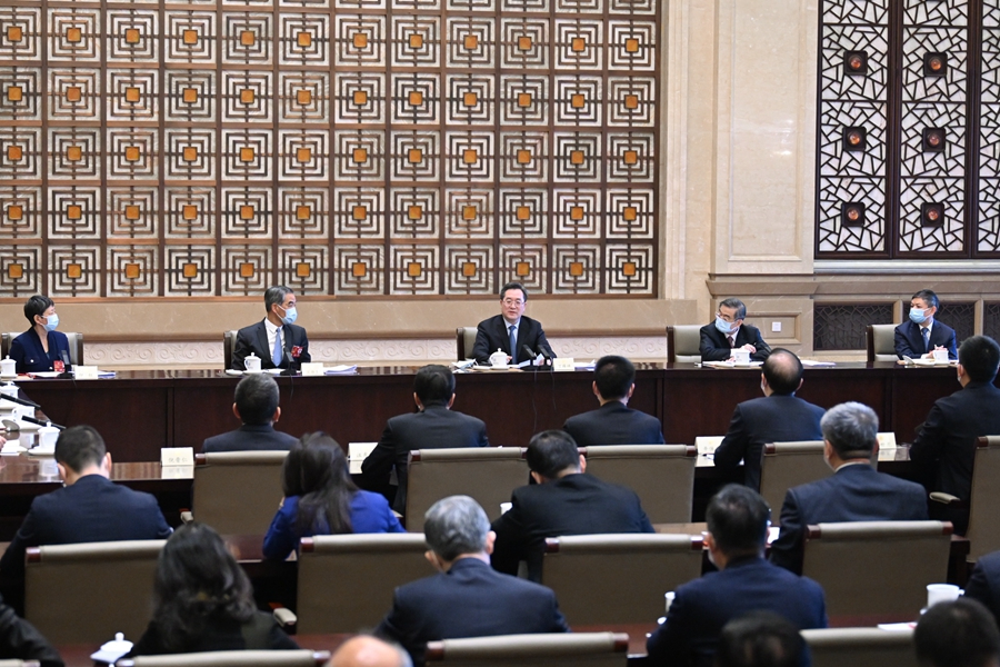 3月6日,中共中央政治局常委赵乐际看望出席全国政协十四届一次会议的民革、台盟、台联界委员并参加讨论。新华社记者 岳月伟 摄