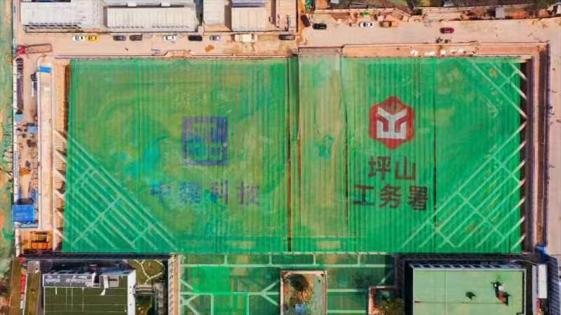因该项目基坑深度达18.7米,加之周边环境特殊,对扬尘防治和文明施工要求极高。为落实“双碳”行动,打造绿色化、智能化工地,中建科技华南公司打造了一款大跨度、智能化的防尘“天幕”系统。该系统由防尘网、滑轮、钢丝绳、驱动电机组、智能控制柜等组成,共分为5个天幕单元,其中4个自动单元,1个固定单元。这一“天幕”系统南北宽74米,东西长172米,覆盖面积约1.3万平方米,是坪山区首例防尘“天幕”,同时也是目前深圳市跨度最大、单块开启单元最大的防尘“天幕”系统。