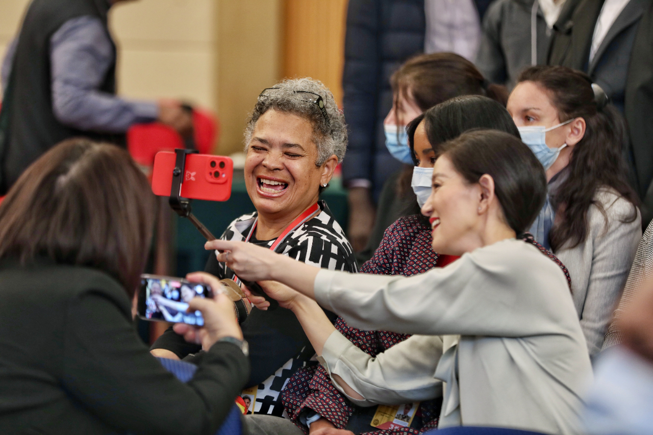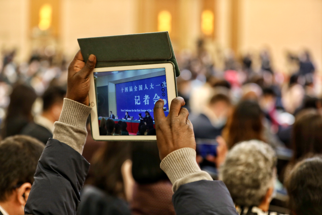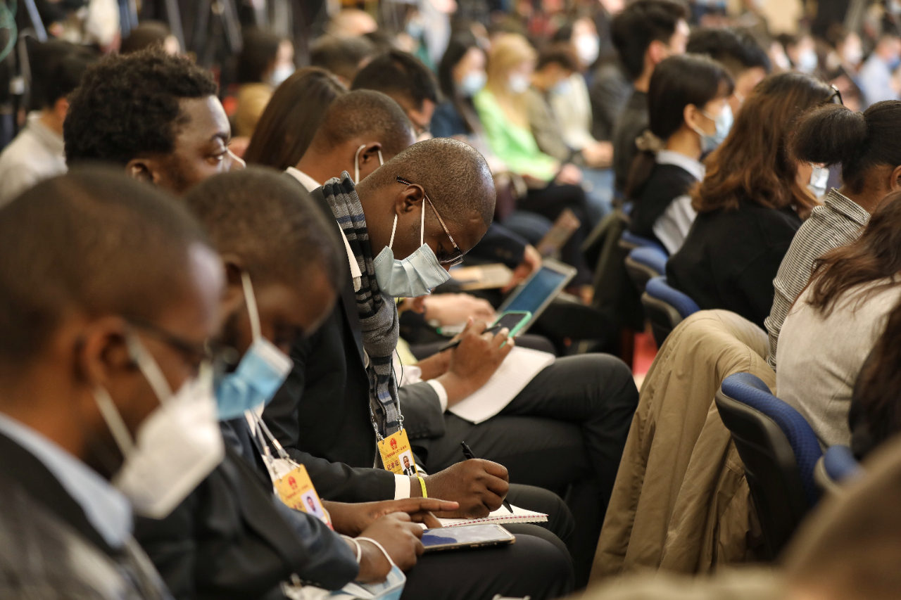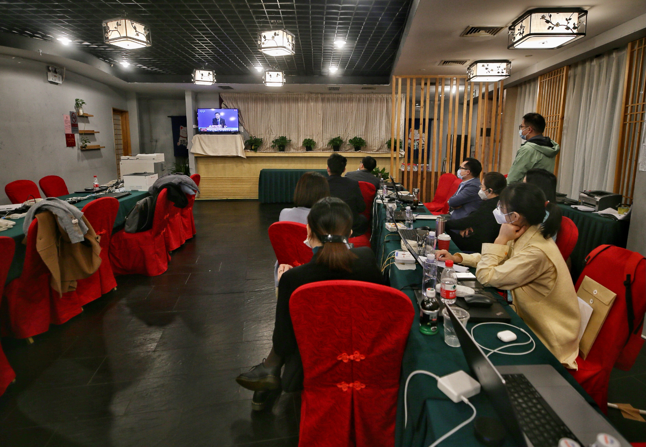 梅地亚新闻中心工作间,工作人员正在看直播。