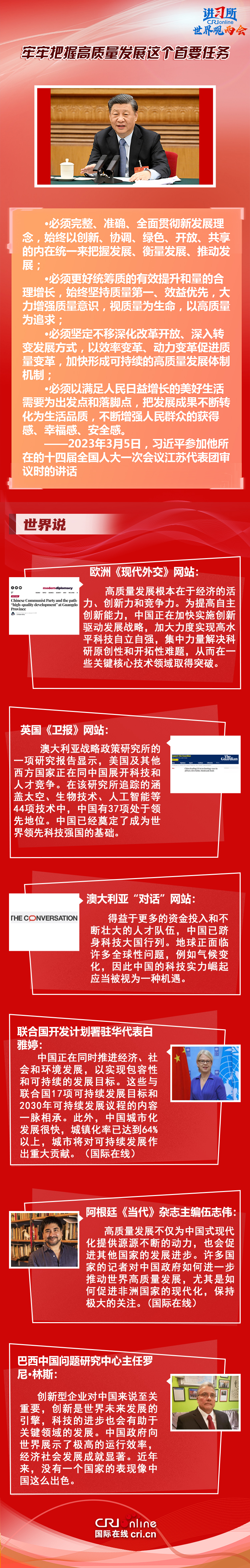 【本期导读】3月5日,中共中央总书记、国家主席、中央军委主席习近平参加他所在的十四届全国人大一次会议江苏代表团审议时强调,高质量发展是全面建设社会主义现代化国家的首要任务。作为观察中国政策风向的窗口,国际社会将目光投向正在召开的中国两会,期待中国高质量发展为世界带来更多机遇。