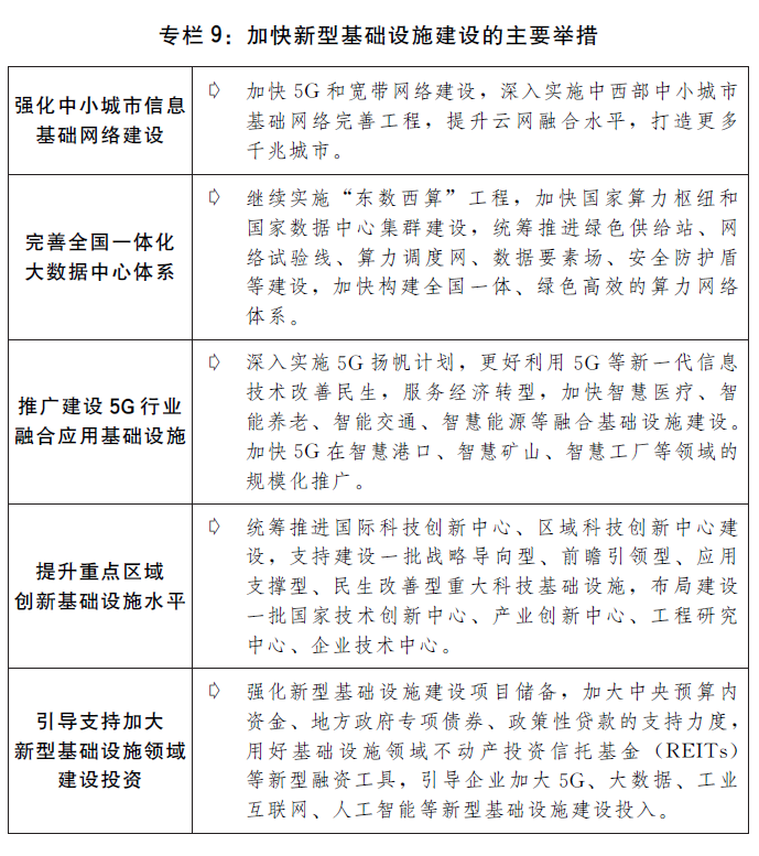 (计划报告中的专栏9:加快新型基础设施建设的主要举措)