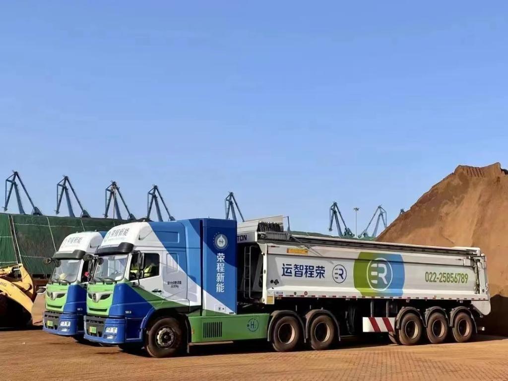 荣程集团氢能重卡在天津港码头装卸矿粉。(受访者供图)
