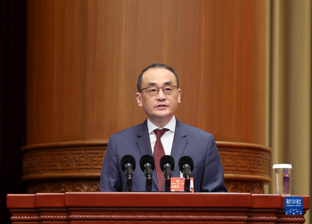 3月9日,全国政协十四届一次会议举行视频会议,委员作大会发言。这是在主会场,江广平委员代表全国总工会作大会发言。新华社记者 丁海涛 摄