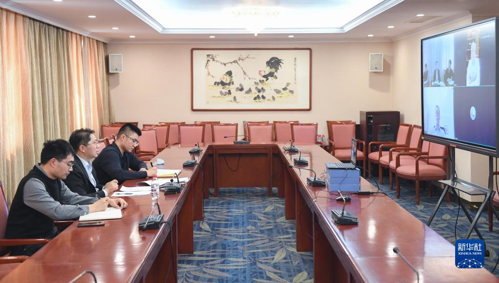 3月8日,科技部成果转化与区域创新司二级巡视员陈宏生(左二)和他的两位同事在科技部与全国政协委员隆克平等视频连线。新华社记者 戴天放 摄