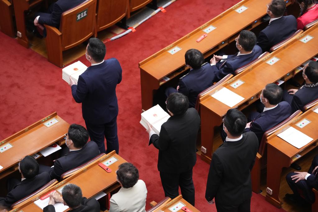 3月10日,十四届全国人大一次会议在北京人民大会堂举行第三次全体会议。这是工作人员发放选票。