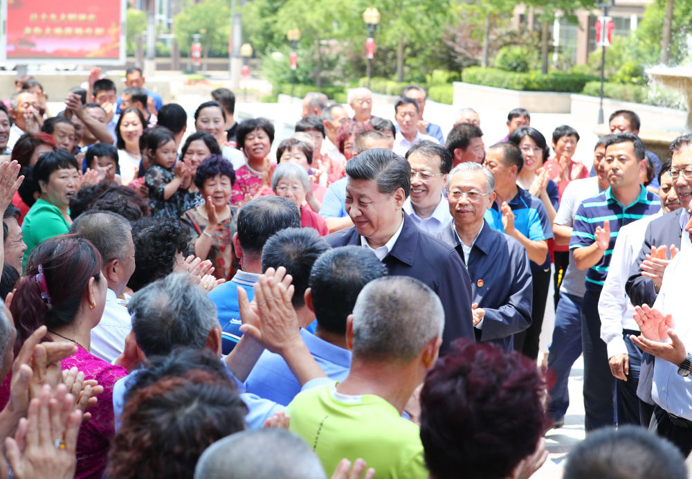 2018年6月12日,习近平在山东省青岛市李沧区世园街道上流佳苑社区同居民亲切握手。