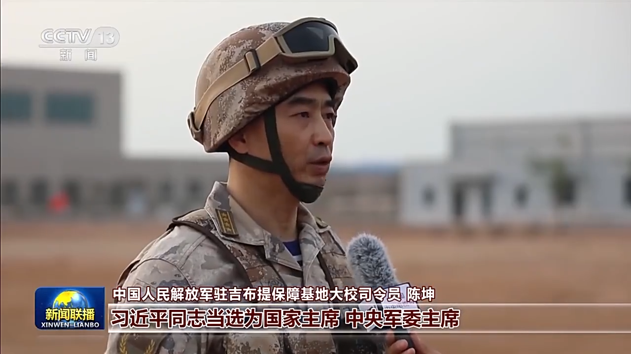 中国人民解放军驻吉布提保障基地大校司令员 陈坤:习近平同志当选为国家主席、中央军委主席,海外基地全体官兵十分振奋、坚决拥护。我们一定坚决听从习主席号令,绝不辜负习主席厚望重托。