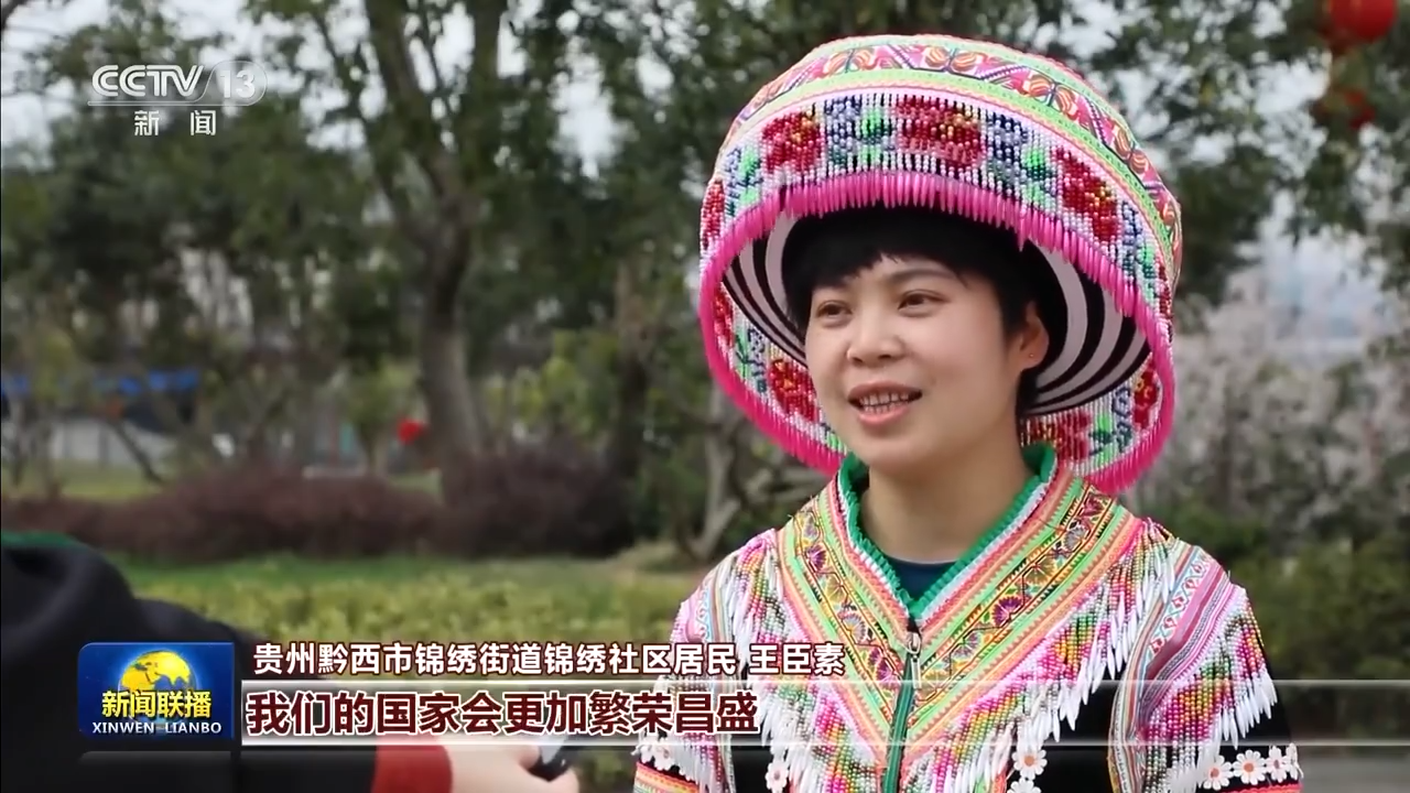 贵州黔西市锦绣街道锦绣社区居民 王臣素:在习近平主席的关心和关爱下,我们搬出了大山、住进了新社区。我们把对美好生活的向往,都绣进了苗绣产品里。我们相信在习近平主席的带领下,我们的国家会更加繁荣昌盛,老百姓的日子会越来越好。