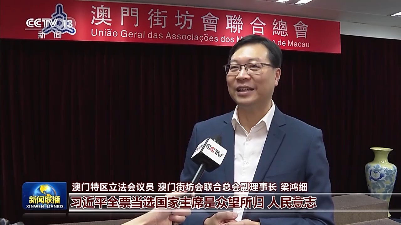 澳门特区立法会议员 澳门街坊会联合总会副理事长 梁鸿细:习近平全票当选国家主席是众望所归、人民意志,体现了习近平主席在包括澳门同胞在内的全国人民心中的崇高威望。我们坚信在习近平主席的掌舵领航之下,澳门市民的生活会更加幸福,产业多元发展的前景会更加广阔,“一国两制”实践会进入前所未有发展的新篇章。