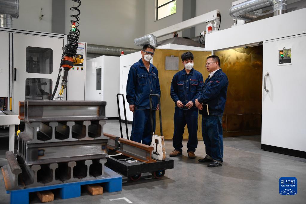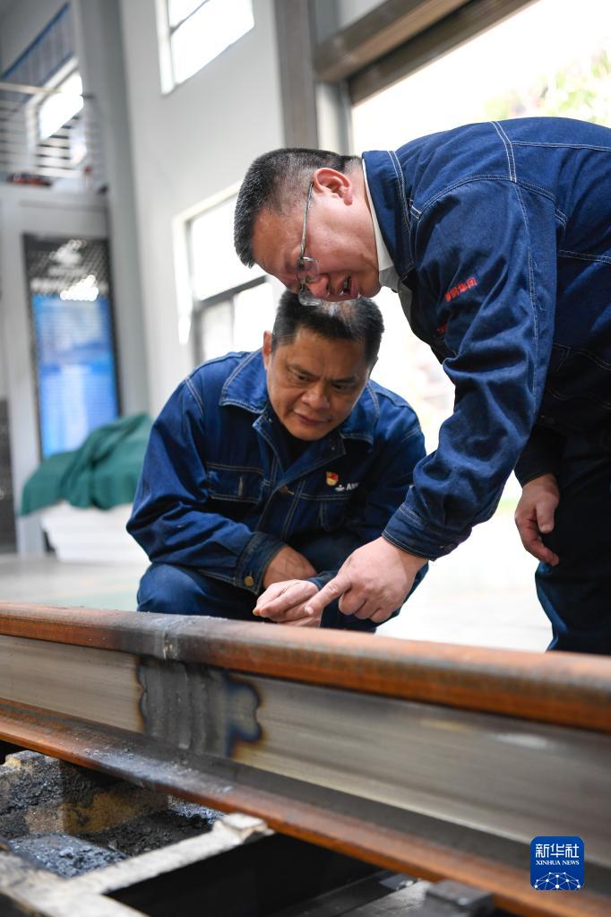 邹明(右)与同事观察轨道焊接实验中的焊缝情况(2月21日摄)。