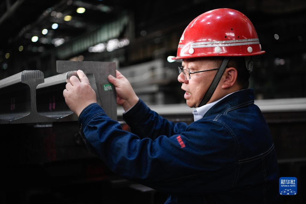 邹明在鞍钢集团攀钢攀枝花钢钒有限公司轨梁厂检查成型钢轨表面情况(2月21日摄)。