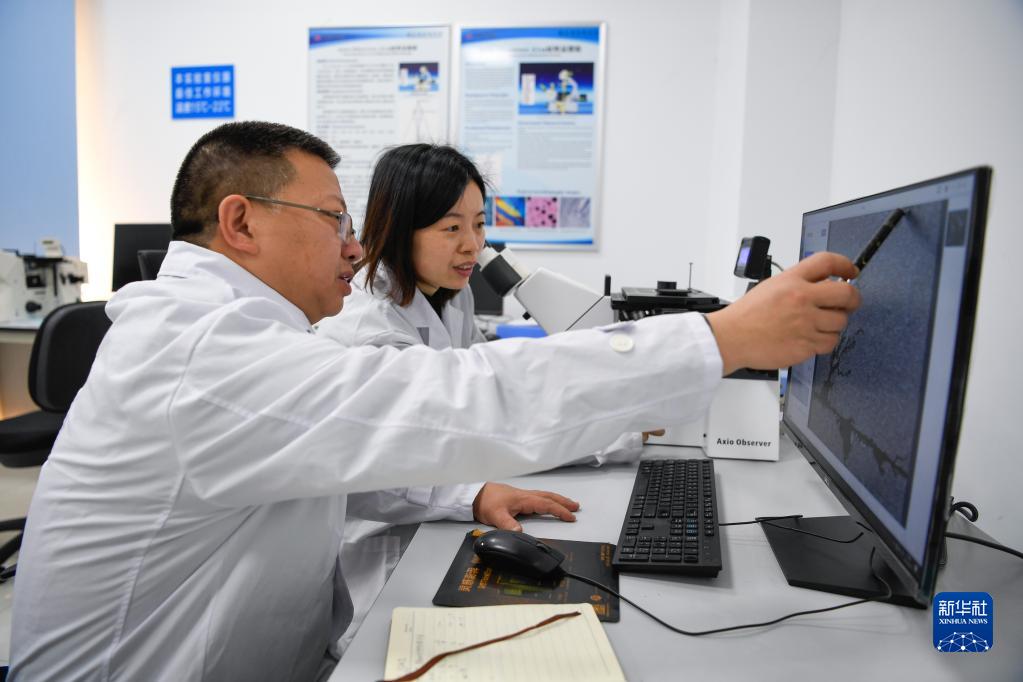 在攀钢集团研究院,邹明(左)与同事在实验室工作(2月21日摄)。
