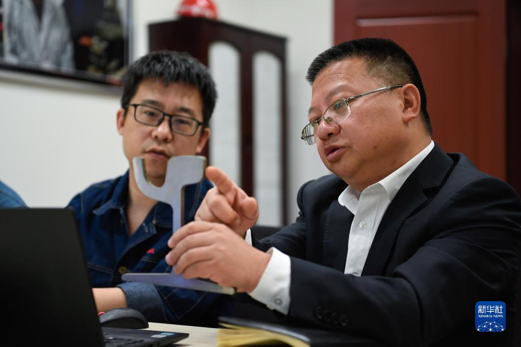 在攀钢集团研究院,邹明(右)与同事一起讨论道岔设计方案(2月21日摄)。