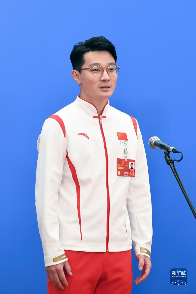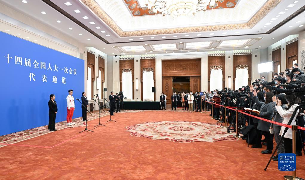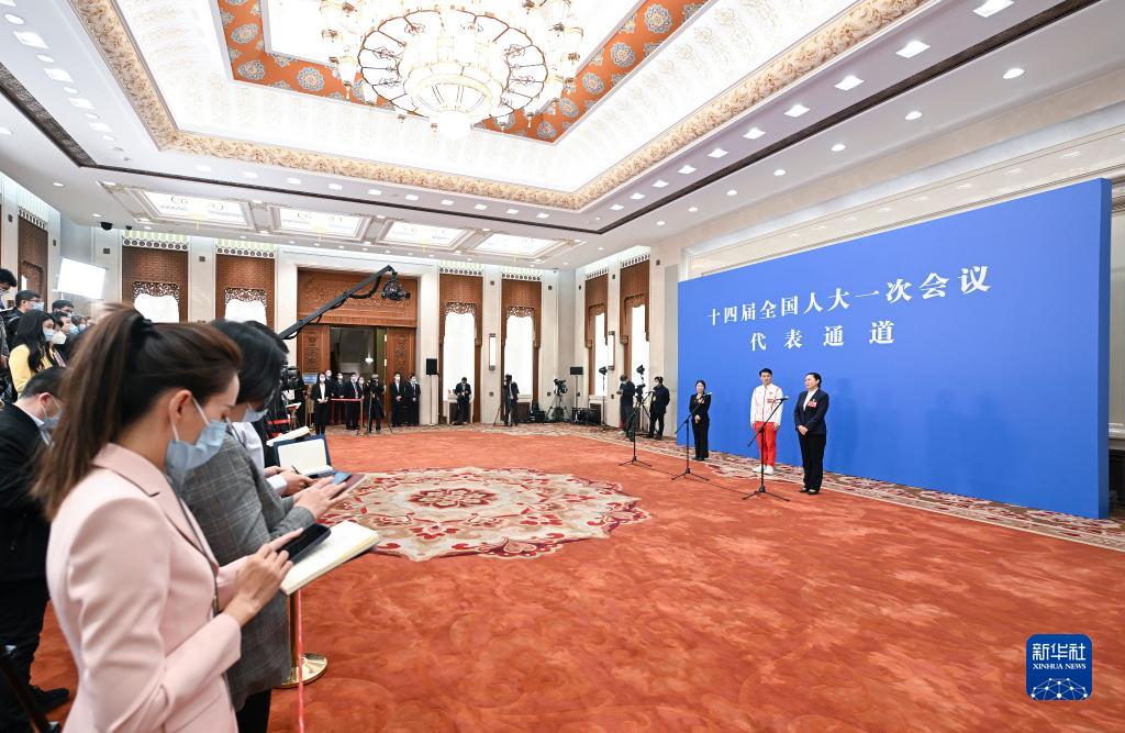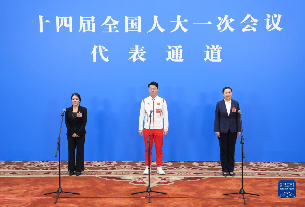 3月12日,第十四届全国人民代表大会第一次会议举行第三场“代表通道”采访活动。这是全国人大代表任子威接受媒体采访。新华社记者 张豪夫 摄