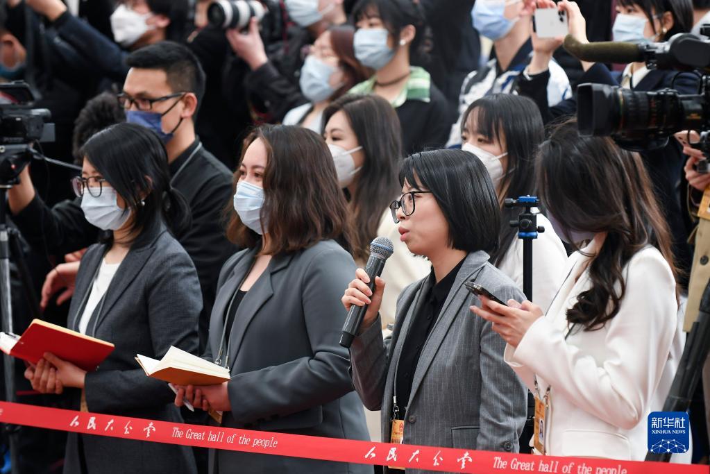 3月12日,第十四届全国人民代表大会第一次会议举行第三场“代表通道”采访活动。这是记者在现场提问。新华社记者 张豪夫 摄