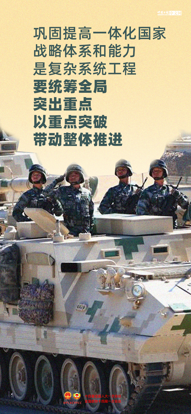 中共中央总书记、国家主席、中央军委主席习近平8日下午出席十四届全国人大一次会议解放军和武警部队代表团全体会议。在6位代表发言后,习近平发表重要讲话,重点围绕巩固提高一体化国家战略体系和能力提出要求。巩固提高一体化国家战略体系和能力怎么做?一起来看。