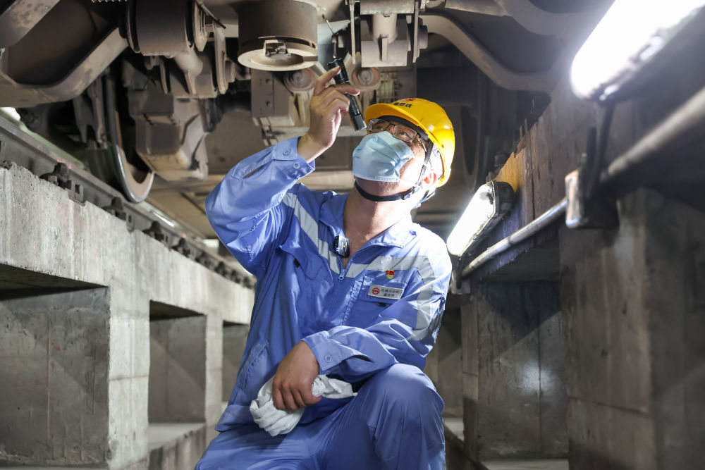 8月1日,上海地铁维护保障有限公司车辆分公司高级技师盛忠明在检修维护地铁车辆。新华社记者 王翔 摄