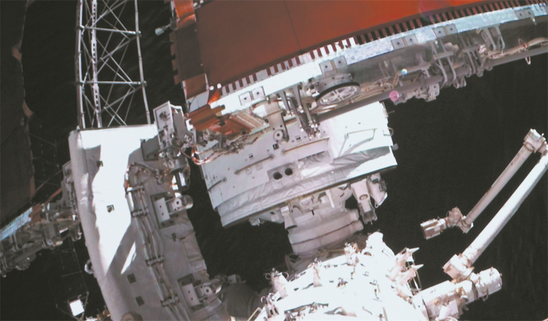 站在机械臂上,视角最好的时候,航天员可以看到空间站全貌。在蓝白相间的地球背景下,“问天”“梦天”像是空间站张开的两翼,缓慢地绕着地球家园飞翔。头顶是浩瀚宇宙,脚底下是空间站和地球,静静地身处其间,再也没有一刻能比此时更令人自豪。