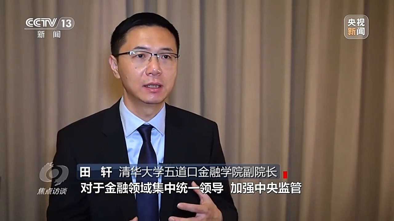 清华大学五道口金融学院副院长 田轩:体现了党和国家对于金融市场、金融监管和金融高质量发展高度重视,核心逻辑体现了党中央对金融机构,对金融领域集中统一的领导,加强中央监管。强调的是功能监管、行为监管、职能监管,还有机构监管,穿透性的监管,这样一个总体思路。