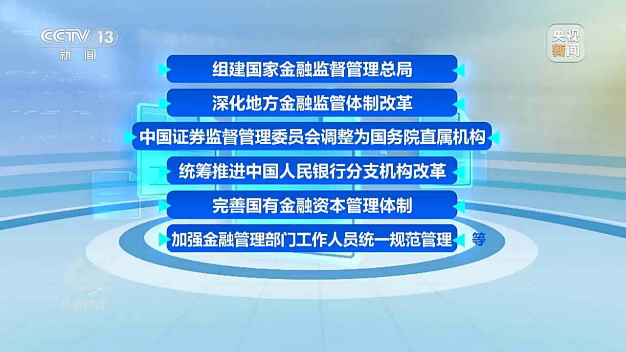 在深化国务院机构改革中,与金融监管直接相关的有6项之多,包括组建国家金融监督管理总局、深化地方金融监管体制改革、中国证券监督管理委员会调整为国务院直属机构、统筹推进中国人民银行分支机构改革、完善国有金融资本管理体制,以及加强金融管理部门工作人员统一规范管理等。