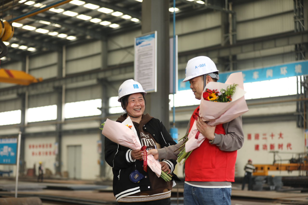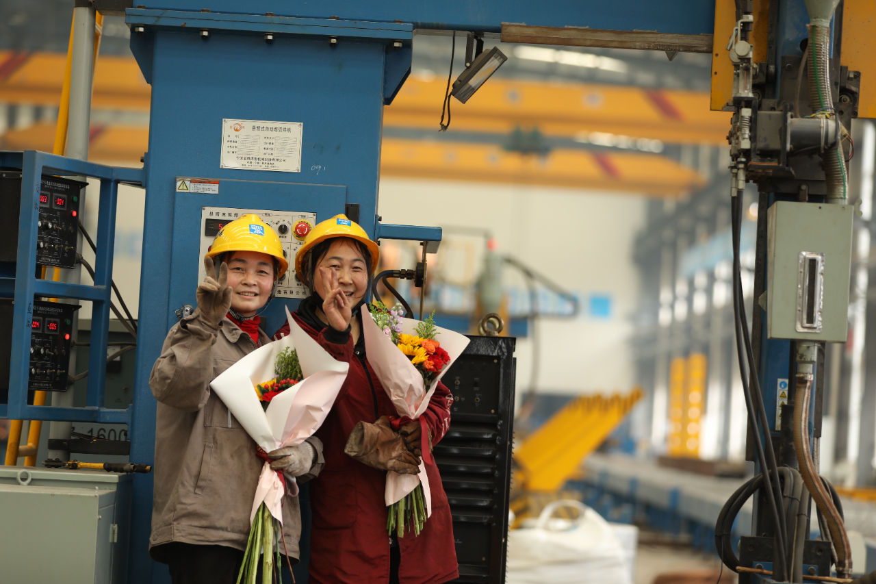 焊花飞溅绽放绚丽色彩,鲜花赠巾帼。收到鲜花的“女焊子”们都露出来灿烂的笑容,志愿者们拍照记录下这些最美的劳动笑脸。