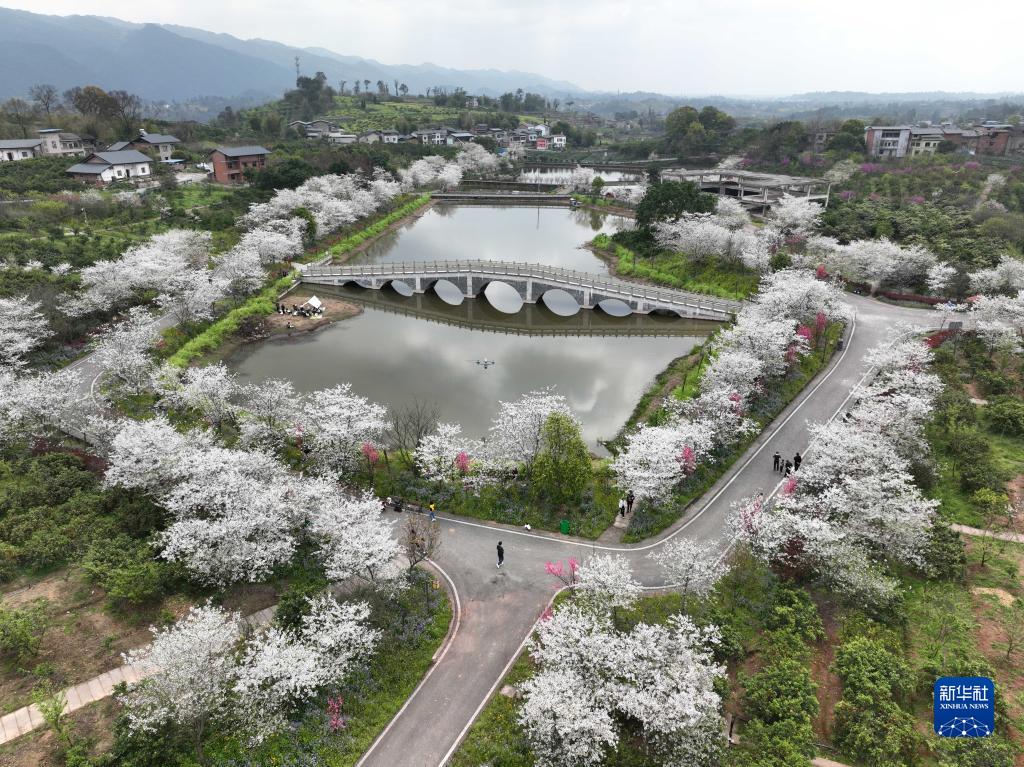 3月19日,游人在重庆市北碚区澄江镇五一村“樱花橘香”农业公园观赏樱花(无人机照片)。
