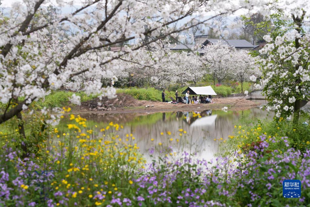 3月19日,游人在重庆市北碚区澄江镇五一村“樱花橘香”农业公园观赏樱花。