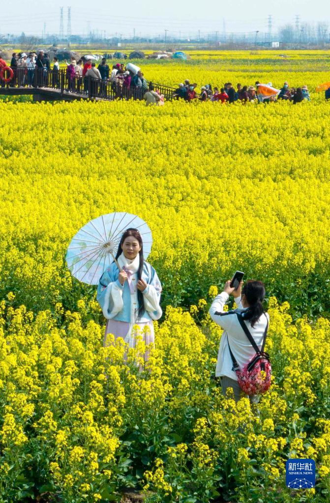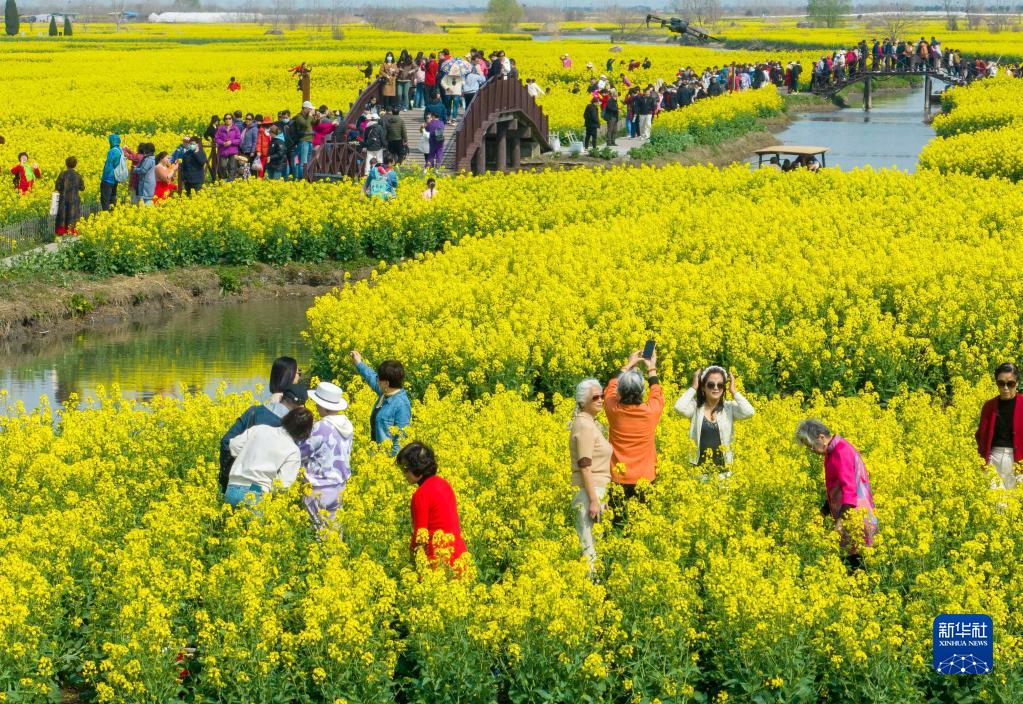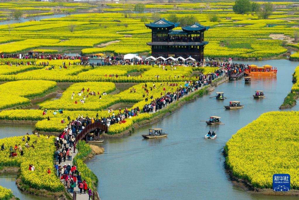 近日,江苏兴化千垛菜花风景区沟河交错围成的垛田上,油菜花次第开放,吸引人们前来踏青赏花。