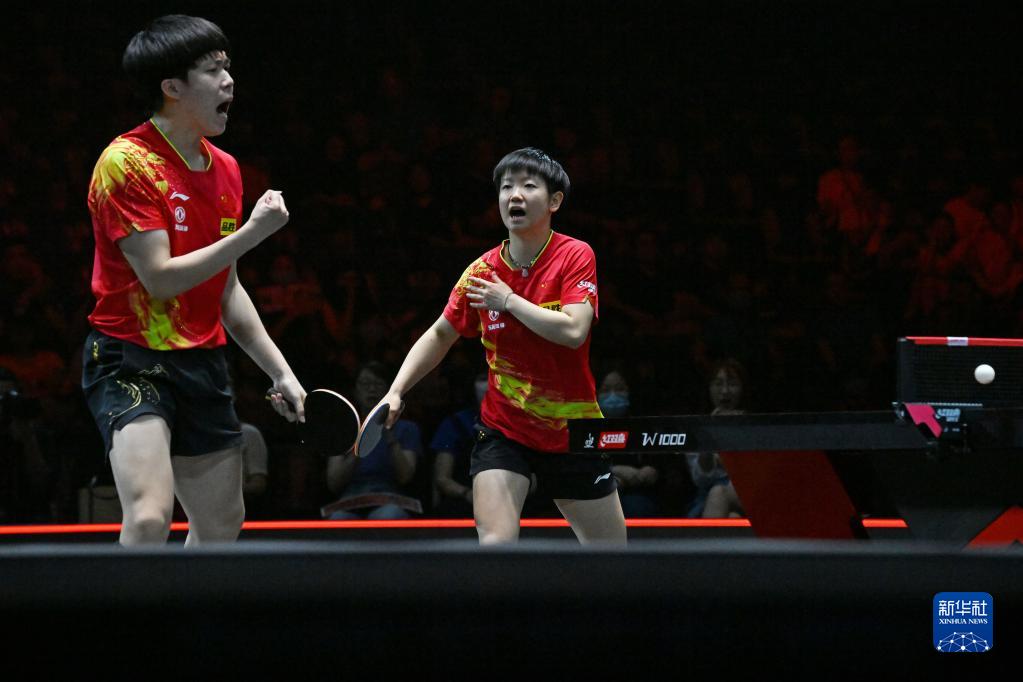 3月16日,王楚钦/孙颖莎(右)在比赛中庆祝得分。新华社发(邓智炜摄)